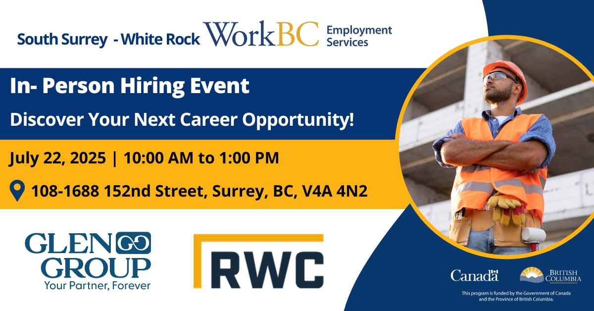 Where: WorkBC South Surrey – White Rock Centre:108 -1688 152nd StreetSurrey, BC, V4A 4N2